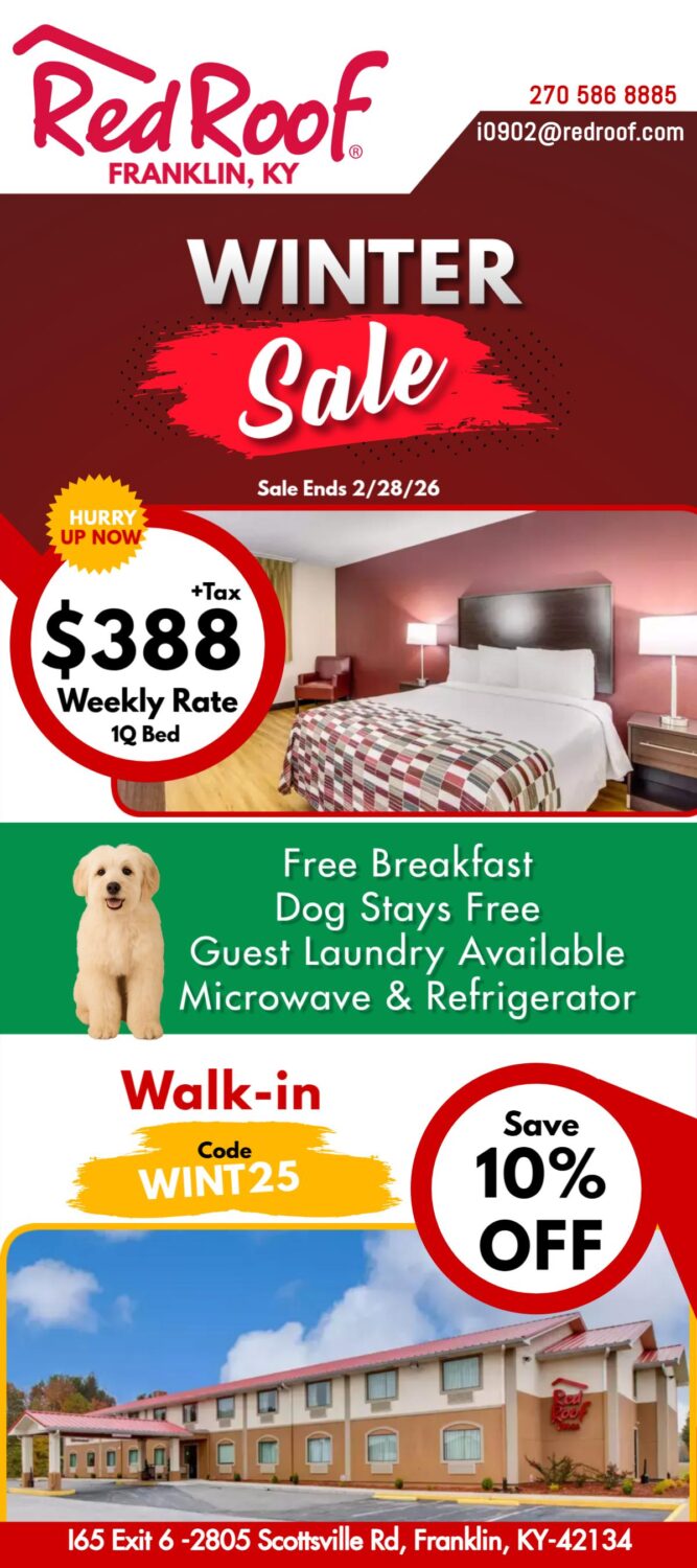 Boasting lodging options from a selection of well-known hotel chains with over 600 rooms, Franklin ensures visitors can find the perfect place to relax and recharge in our quaint corner of the Bluegrass State whether traveling through or staying a few days for business or leisure. Additionally, vacation rentals and cabins nestled in the beautiful Kentucky countryside are available if you’re traveling with a group or looking for a more spacious and home-like setting.